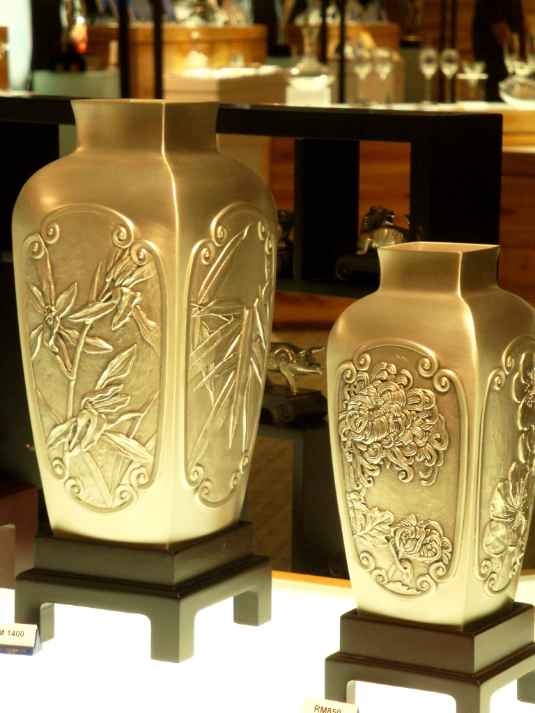 The next stop was their showroom where was displayed many exquisite specimens. I have more pictures of them, but sigh, cannot fit in more here. This jar here costs only RM 1400. Multiply that by 17 and you will get its value in Indian rupees. Not too much, huh? A friend asked me if I hadn’t got any pewter for myself. My response: “What would I do owning such expensive things?” Yeah, I am much better off admiring them from afar.