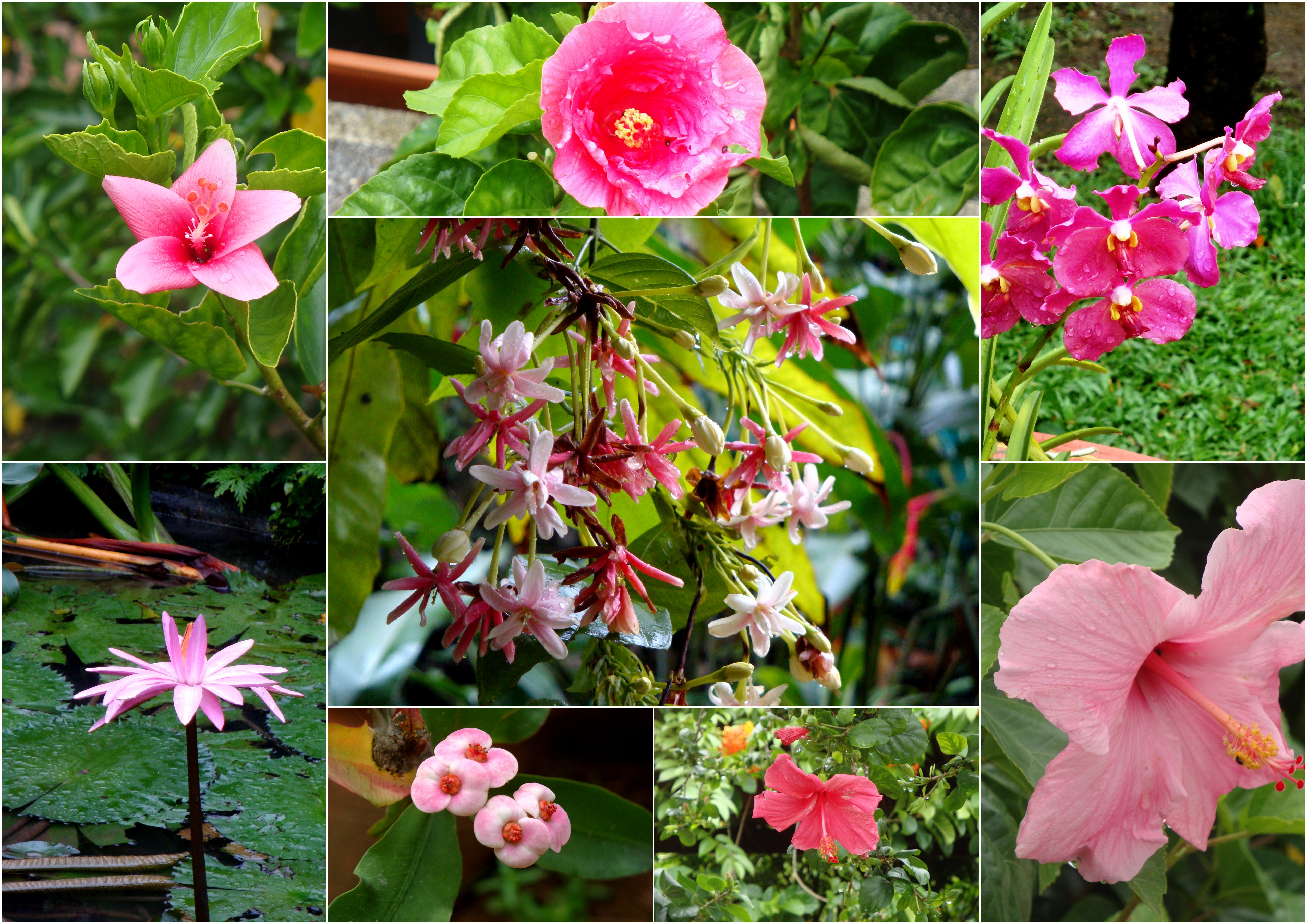 Pink is any of the colors between bluish red (purple) and red, of medium to high brightness and of low to moderate saturation, says Wiki. Here are some hues of pink found in flowers in and around my house.