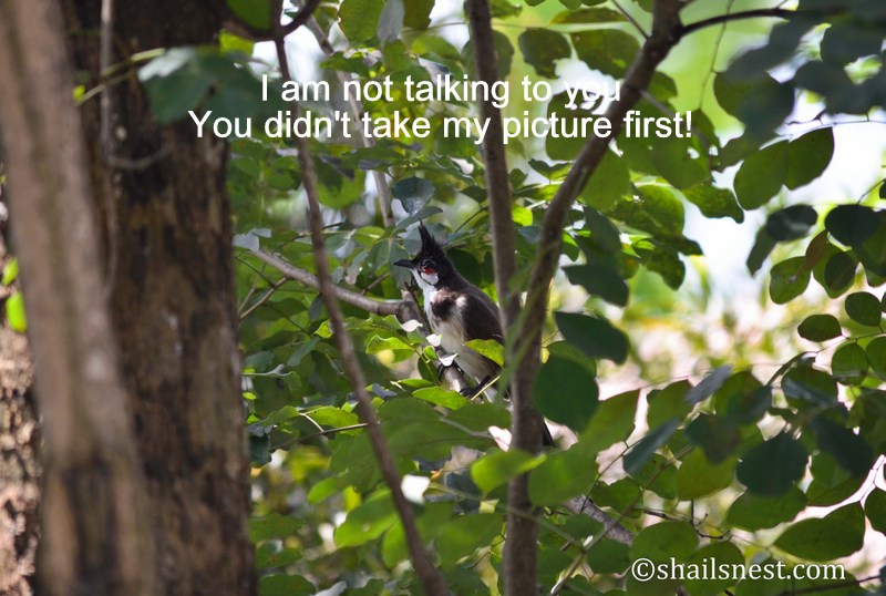 The other day I counted ten little Red-whiskered Bulbuls playing tag in the tree next to my window. They are an amusing lot, ever ready to pose for you. Here are reactions from some of them to the lens going for repairs and also its successful return.