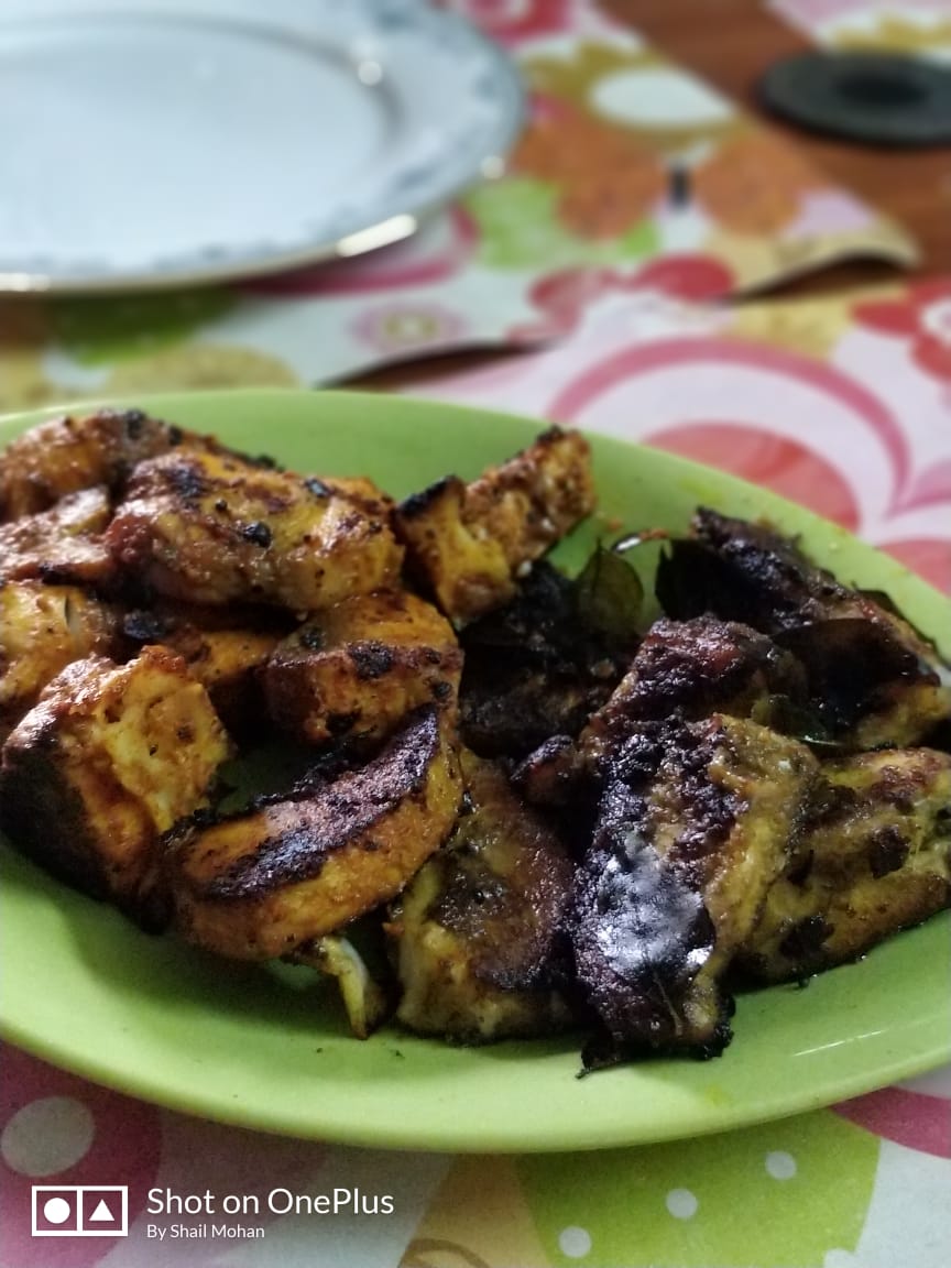 I had stocked up on seafood well before the son reached. There was prawns, milk fish, and mahi mahi. Three days, three different recipes, was my plan. I have a couple of handwritten cookery books, as also cuttings from various magazines collected over the years and kept in folders. Imagine, there was a time when I used to read my cookery books like people read short-stories! But nowadays, I choose to get recipes off the net because it’s a lot faster than thumbing through my collection which has no proper indexing.