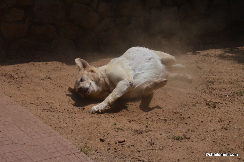 I must have stood there for about two seconds, or perhaps three, but that was all it took for IT to happen. What I saw when I lifted my dreamy gaze off the butterfly, was the Dog about to fling herself on to the dusty – dustiest – corner of the front yard. ‘LU..’ I yelled, too late, and hence finished it with a tame ‘..ci!’. The deed was done. The Dog was merrily rolling on the ground, kicking up dust that rose lazily in a haze.