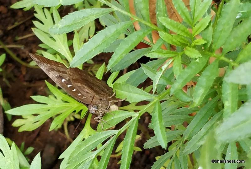Just before we round the corner back to the front of the house, there is a shady spot, the shade provided free of cost by the mango trees growing next-door, and in that shade stand a few flowerpots. Almost every single noon just as soon as I reach the shady spot, a Centaur Oakblue flies out of nowhere, flutters around a bit and then disappears into the foliage of the mango tree. Today though, it rested on the leaf of a marigold plant and I, without thought, and enchanted by the fluttering wings, paused to watch, instead of duly herding the Dog right back into the house, out of temptation’s way.