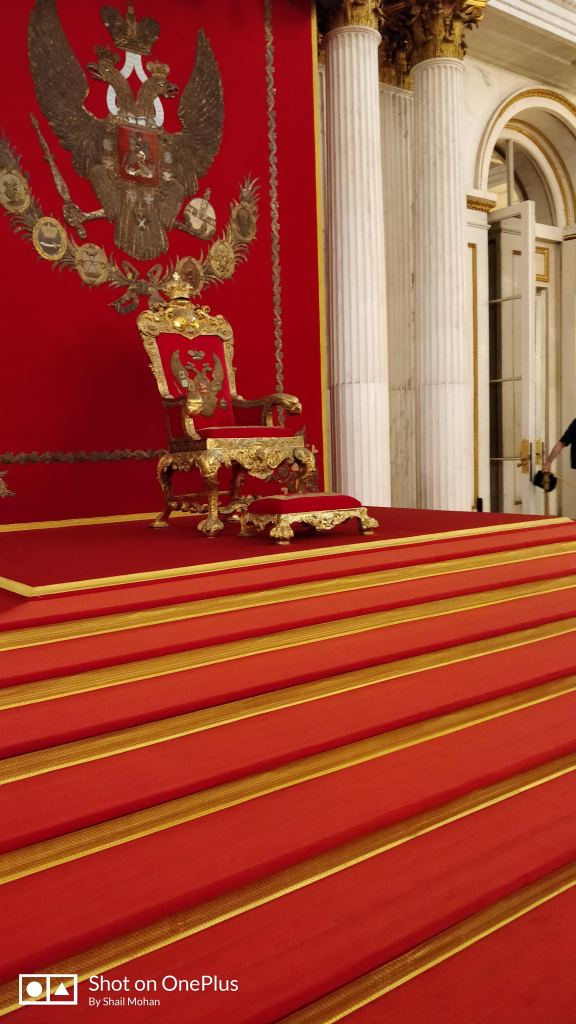 The sky looked beautiful as we walked out of the restaurant, tired, but happy. There was sleep to catch up on from the previous night’s wanderings. And this had been a long and full day as well. What would we dream of tonight? Would it be of living in a long gone era in the Winter Palace of the Romanoffs with the ingenious queen who, when she found she couldn’t wear her crown in the chapel (‘No one wears one in the house of God!’) circumvented the whole thing by building a canopy above her seat and putting the crown on top of it? Would we sit in the throne room fascinated, watching the King and his courtiers conduct the business of running an empire? May be we’d walk up the Ambassadorial Staircase with foreign envoys to attended official ceremonies? Or… The possibilities were endless. We only had to fall asleep to find out!