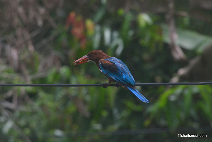 The other day, she was perched on the electric cable right opposite my balcony. She wants me to click her, I decided, and quickly obliged. At least, I tried. But she was nowhere in the picture I clicked. All I had for my efforts was the photo of a cable devoid of any birds. She had dived down in a brilliant splash of blue. Having deftly caught her prey, a dragonfly, she was soon back on the cable, feasting on it.