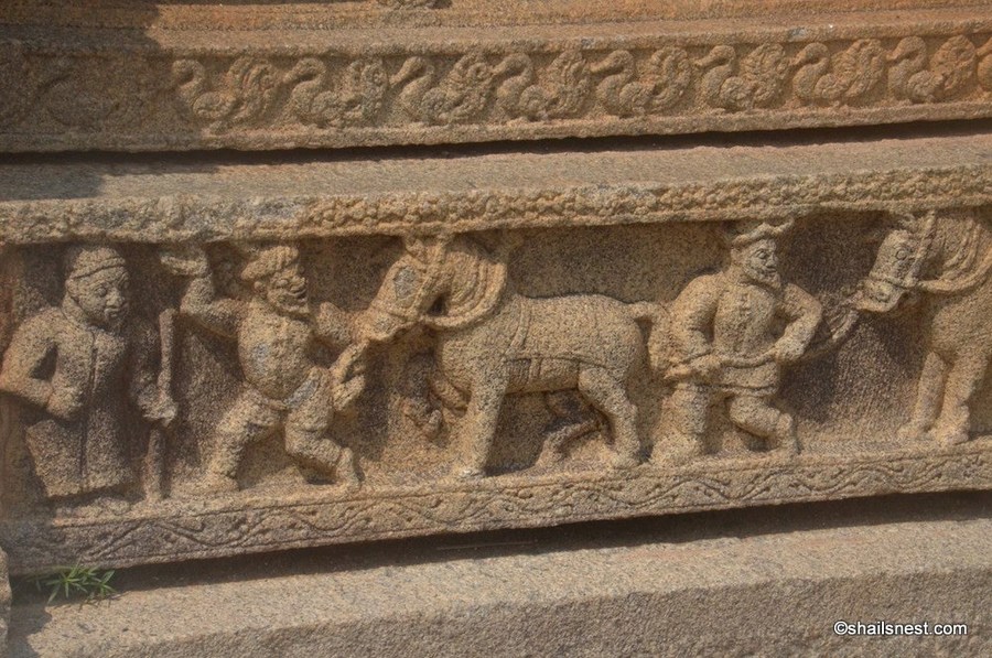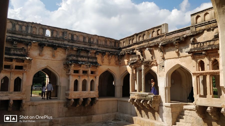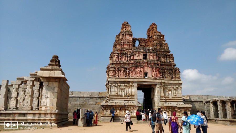 The entrance to the Vittala temple complex. One side of the structure has been restored, the other not.Situated just outside the entrance to the temple complex, this is part of what used to be a thriving market. From flowers to horses, everything was sold here. Just pause and imagine the hustle and bustle that would have been on market days!Women could be warriors, dancers, wrestlers in short everything, in the Vijayanagara empire. The King himself had female warriors as guards. How did we descend to this lowly existence of confining women to home and hearth from those days? In this picture you find women warriors practicing their craft.Vijayanagara had trade connections far and wide. The King is supposed to have owned horses of the finest breed from as far away as Mongolia. The features of the people in some of the carvings is proof (according to the guide) of their visits. A few even married locals and settled down in the city, said he.This is our guide whose English was Greek to me. Yes, he is the same guy who said I don’t know to take pictures π All the same his heart was in the right place! The “wimmen” in front of the iconic stone chariot in the Vittala temple complex. I don’t have to point out which one is me, right? Oh btw, all ye Indians, you gotta tell me where you come across this chariot often. Let’s see if you are as clueless as I was till the guide enlightened me. A stone plate off which soldiers ate (kept in the museum). Can you imagine the effort involved in trying to clean this? Ahh, presumably it wasn’t too difficult because these plates were carved into the stone surface on either side of a small canal made for the explicit purpose of availability of water to clean these plates. Ingenuous, what?Lotus Mahal, also known as Chitrangani Mahal and Kamal Mahal, is located inside the zenana enclosure. Made out of lime mortar and brick, apparently, it is the shape of the structure that gave it its name.A closer look at the beautiful arches in Lotus Mahal.Mahanavami Dibba, is pyramidal, three tired stone platform, in the royal enclosure. It was one of the most important ceremonial structures of royal use and is dated to the 16th Century. The King and his entourage sat on top to watch ‘sports’ of the day, wrestling and suchβ¦ And then ‘prizes’ were given to the winners. I didn’t dare climb it because of the hot afternoon sun and of course the rather steep incline.Queeen’s bath, in the Southeast of the Royal Enclosure. It is a structure in the Indo-Islamic style of Vijayanagara architecture. Inside the Queen’s Bath. While I stood there I was trying to imagine the sene as it must have looked in the past: The women of the royal household bathing, frolicking in the cool water (now it is dry), while their personal maids waited above to be of service as soon as they were done.Constructed in the 15th century, this impressive structure was used to house the royal elephants of the Vijayanagara Empire. Each chamber is large enough to accommodate two elephants at a time. The architecture is Indo-Islamic.The Virupaksha temple, intact among the surrounding ruins, is still in use as a place of worship. It was built by Lakkan Dandesha, a nayaka (chieftain) under the ruler Deva Raya II of the Vijayanagara Empire