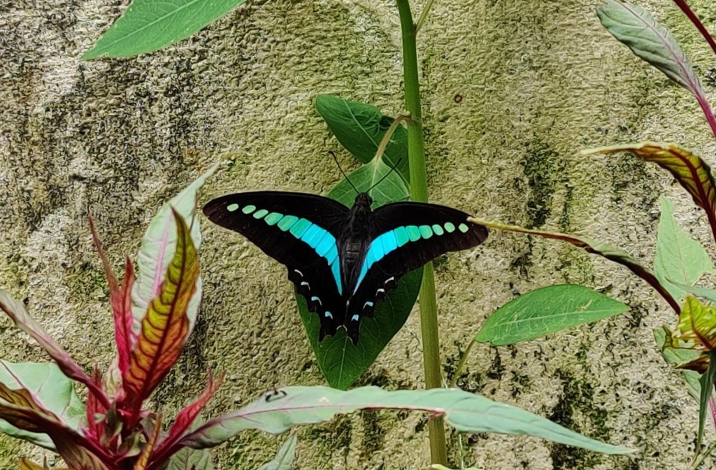 A Narrow-banded Bluebottle (Graphium teredon) is resting on the balsam with its wings open. It is sure to disappear if I run upstairs to get my camera. The phone will have to do for now. Stretching my hands as close as I dare, I take a few pictures and then start recording a video.