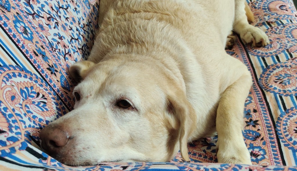 This is how Luci prefers to sleep these days, with her head raised and resting on the handle of the sofa, or the raised edge of the cot. The ‘posing’ for this photo was quite involuntary, she having woken up from sleep on hearing my footsteps too late. Caught off-guard, she did not have enough time to rearrange her features to the usual resigned, oh-no-not-again expression. So, what you see is the I-will-just-pretend-I-am-not-aware-what-is-happening pose.
