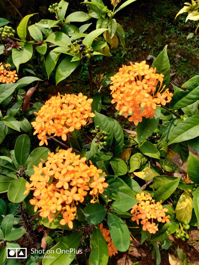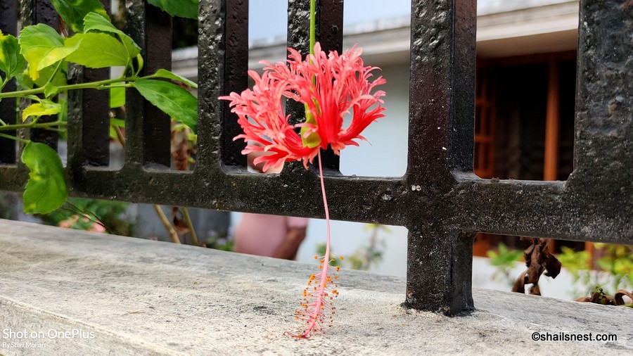 The single yellow flower is a wild one growing among the garden plants. No one planted it, no one knows what it is or where it came from. The ‘gardener’ of the house thinks the creeper should remain. The flower is so pretty. He may yet regret his decision because I notice that it is trying to overrun its neighbors. As for the yellow ixora, it is all happiness and smiles with delightful bunches of flowers on display. The hanging hibiscus is makes a pretty picture against the black painted grill.