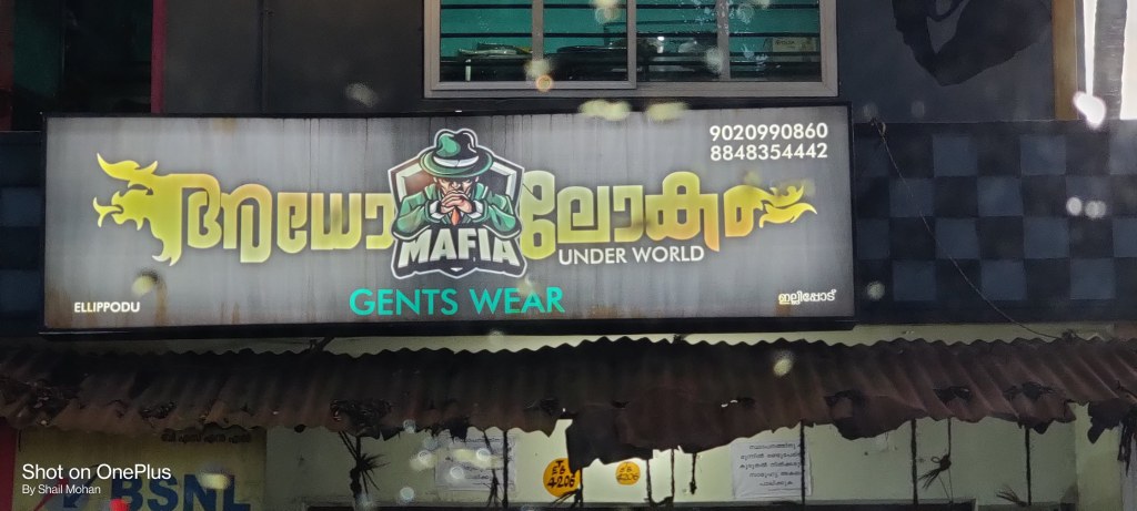 Last week while returning from a look at our new apartment, the L&M stopped at a junction awaiting his turn to make a right turn when I saw something across the road. It was a sign board in Malayalam that read ‘adholokam’ (underworld). Wait, what again? Even as I chuckled, I dived into my handbag for my phone while fervently hoping that the L&M would not get an opportunity to make the turn. Luckily I got my chance and clicked a picture.