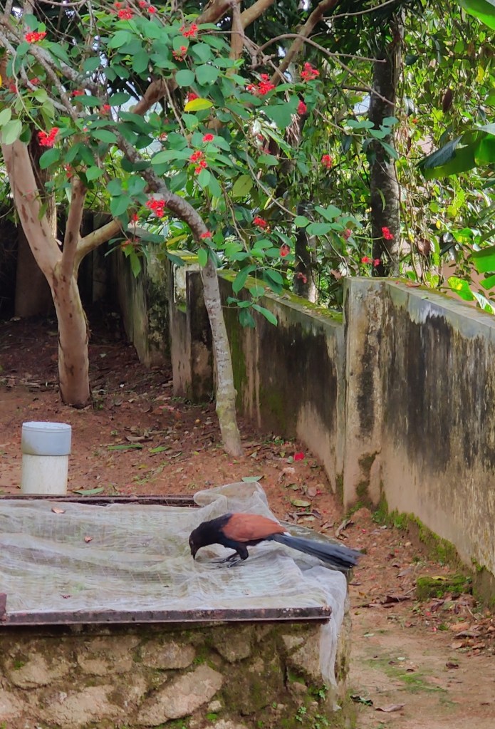 The Southern Coucal aka the Crow Pheasant gave me a fright by suddenly descending from the treetop on to the metal covering of the rain water storage well. It was intent on pecking at, I am guessing, insects. When it saw me it stopped pecking and tilting its head looked at me with beady red eyes. Friend or foe, it seemed to ask itself. The answer must have been ‘friend’ because it went back to looking for insects to feast on.