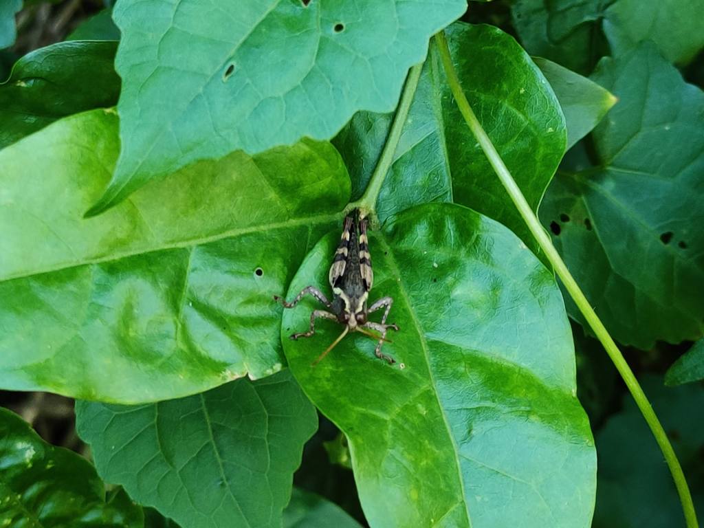 While I was thus occupied, someone else had eyes on me. Bulging eyes, if I may add. It was sitting on a leaf of the jasmine vine and looking up at me warily. Slowly, with no jerky movements, I fished out my phone and took a picture. It was mighty miffed at this invasion of its privacy. With a slight disapproving flick of its wings, which revealed a pretty red streak, it jumped off the leaf and disappeared.