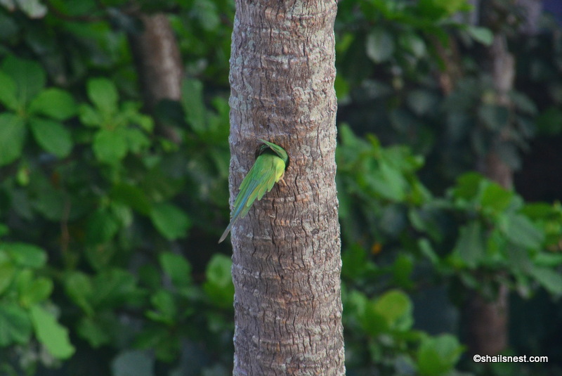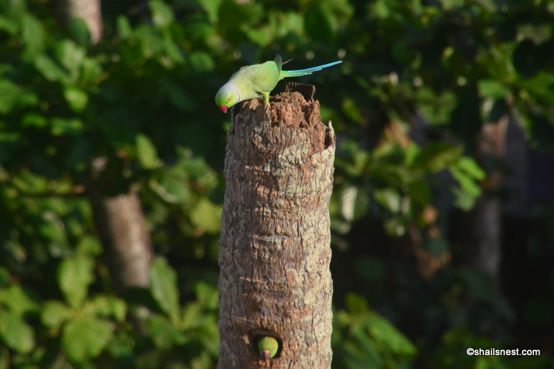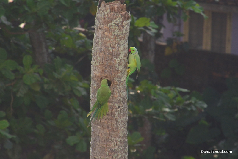 My camera was nowhere nearby. I wasn’t even sure the battery was charged. I fervently hoped the birds would return another day. And just like that there they were one day! Only the parakeets. Apparently they had been scouting the tree and the hole in it for laying eggs. I bet they chased the woodpeckers off (“We were here first!”) and they have had to look for accommodation elsewhere.