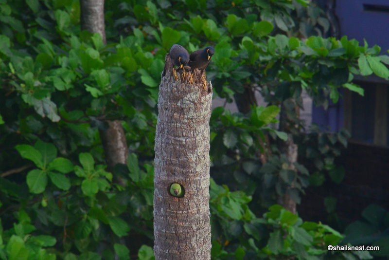 Dad Parakeet comes along regularly to check on Mama. Sometimes they take time off and together fly to a tree nearby. To spend some quality time together I suppose. But she comes back every now and then to check on her eggs. Her immediate neighbors, the mynahs, aren’t to be trusted. I heard them squabble one day. The mynahs, bullies that they are, stood atop the tree calling out threats, but she stood her ground and disappeared into her hole, only her head emerging later to see if the coast was clear.