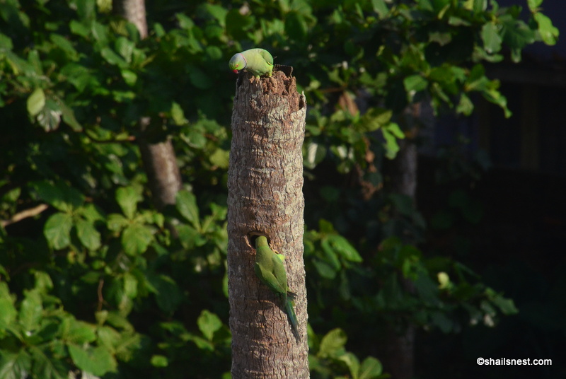 Seriously! How long does it take for rose-ringed parakeet eggs to hatch? Google says close to twenty-three days or thereabouts. But I am pretty sure the Mama Parakeet who is practically my immediate neighbor, living as she does on a coconut tree standing across the balcony off the dining area, has been sitting on her eggs for close to a month now.