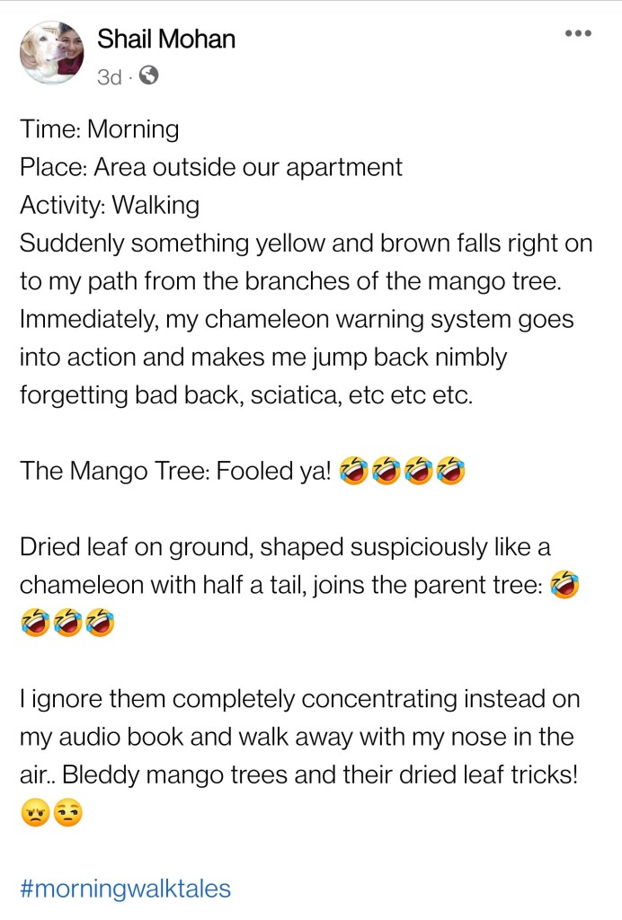 If this wasn’t enough excitement for the week, a mango leaf, masquerading as a chameleon, scared me half to death by jumping off the mango tree the exact moment I was beneath it while on my morning walk. I am not going into the details of it because it is all well laid out for you in the Facebook update I have shared below: