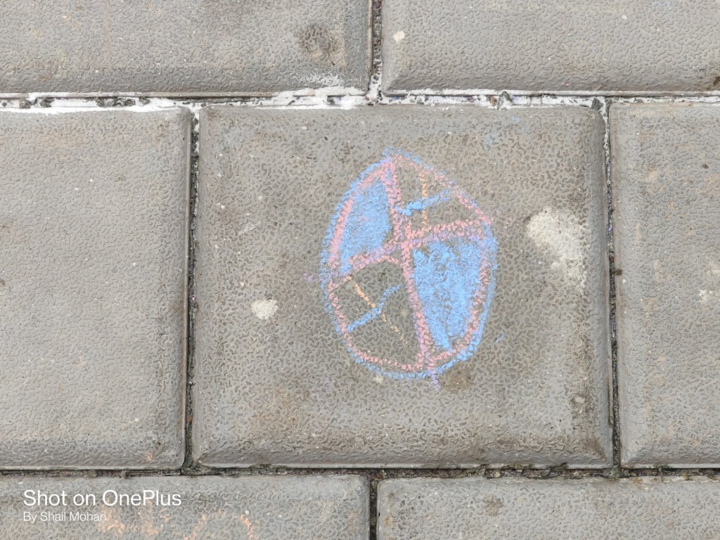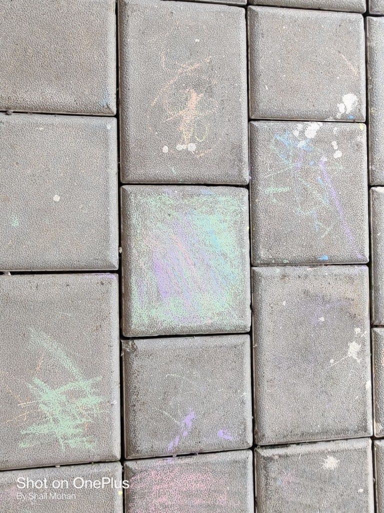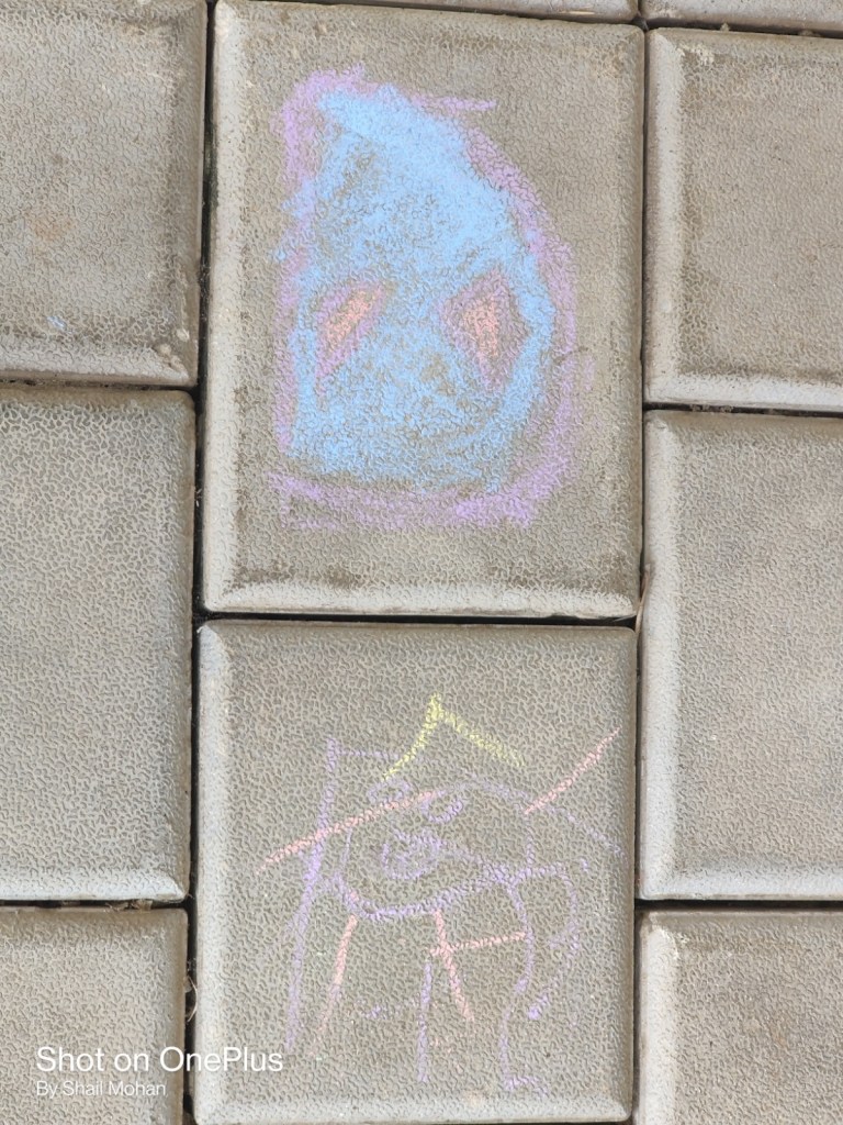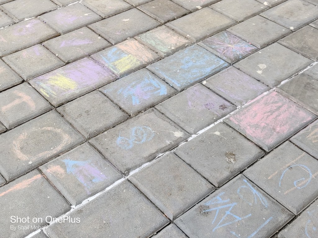 Afterwards as I stood talking with some of the others I noticed a little artist at work. She had a few coloured chalks in one hand, and was colouring away zealously with the other. Impressed by her work, two others joined, and between them they livened up the drab cement coloured tiles of the parking space.