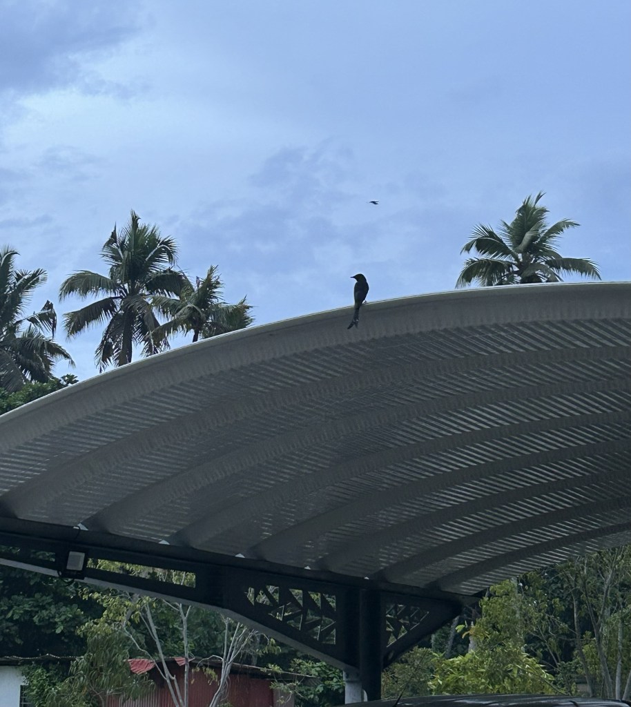 This crow hadn’t come to enjoy the cool morning breeze. It wasn’t even looking for bits of food from me. On alighting on the roof of the garage it promptly made to peck the drongo. Usually drongos are spirited birds and don’t take kindly to crows bossing them. But this one being a juvie immediately took off. Any more opportunities for clicking the drongo was thus lost.