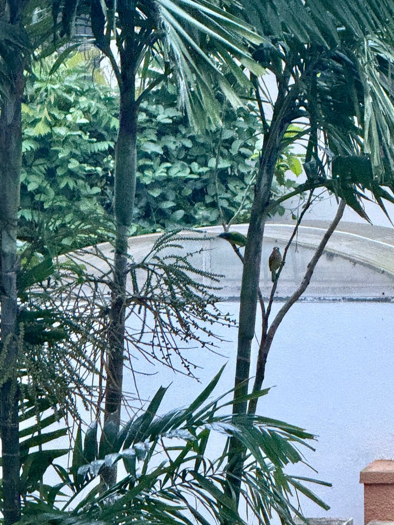 If yesterday’s morning walk was made rich by the mist experience, today’s figured feathered chums making an unexpected appearance. White-cheeked barbets, no less.