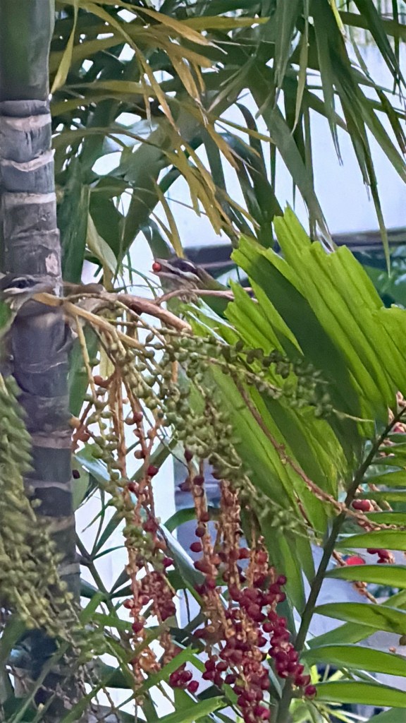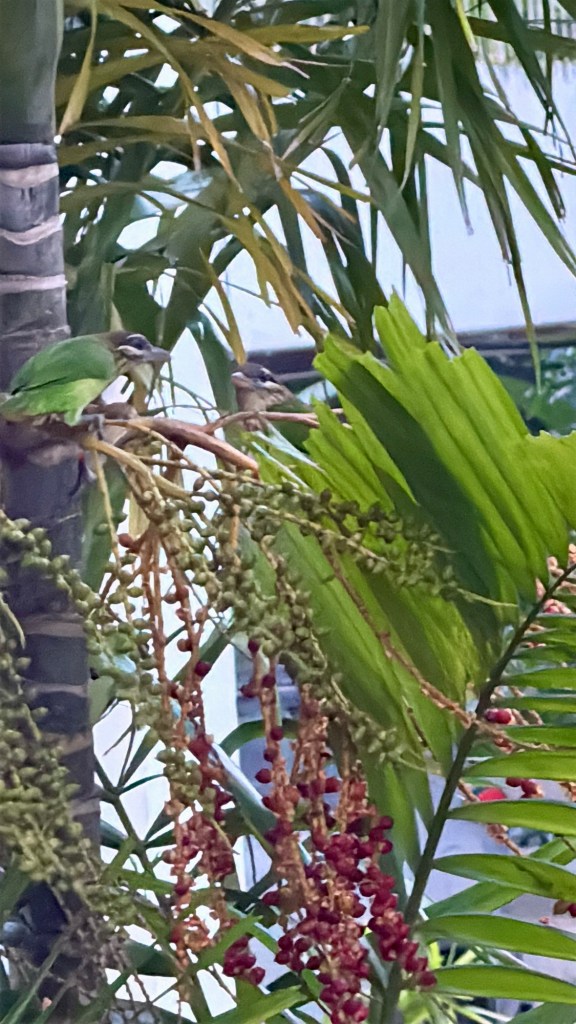 It was good that I waited. I saw one more bird join the first. Together they flew back to the first tree, closer to me (but still far enough that I had to zoom in a lot to get a picture, thereby sadly losing out on clarity) and started feasting on its fruit.