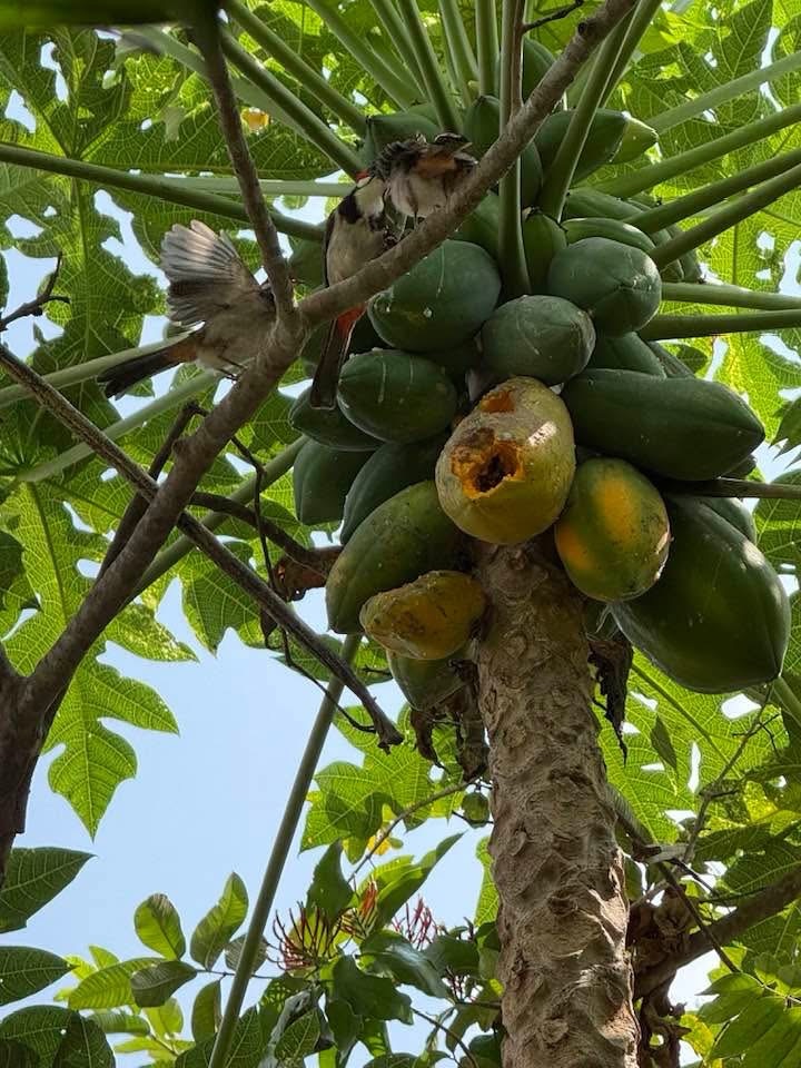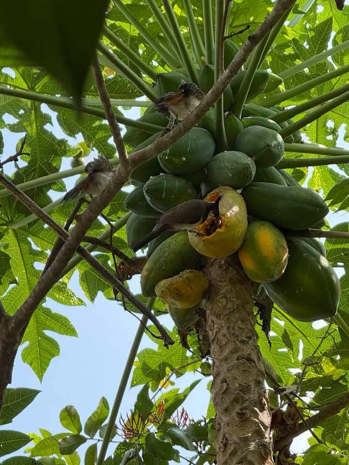 Mama bird started pecking on a ripe papaya on the tree, a bright orange fruit. Looking up from down below, I was thrilled beyond words at the unfolding sight before my eyes. Mama then carefully fed the chicks waiting with their beaks open. Did I take pictures or stand there staring and grinning for all I was worth? Well, actually speaking, I did both.