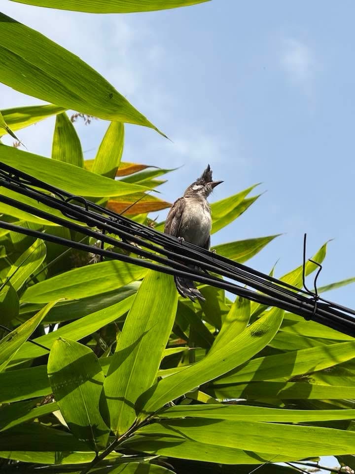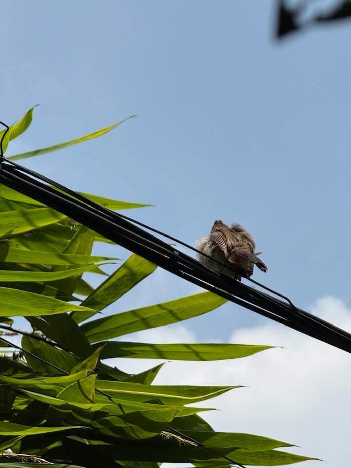 Suddenly the mama bird rose from the bamboo branches and perched on the electric wire above. The little ones followed suit. Yup, I clicked them. Their red whiskers were not yet in evidence. Most of my shots were of their cute butts. Next the mama bird made straight for the tall papaya tree near by. Not to be outdone, the little ones followed her and sat on the branches of a tree growing close to it. Cheeping loudly, they let her know of they were hungry. Food, food, more food seemed to be the clamour.